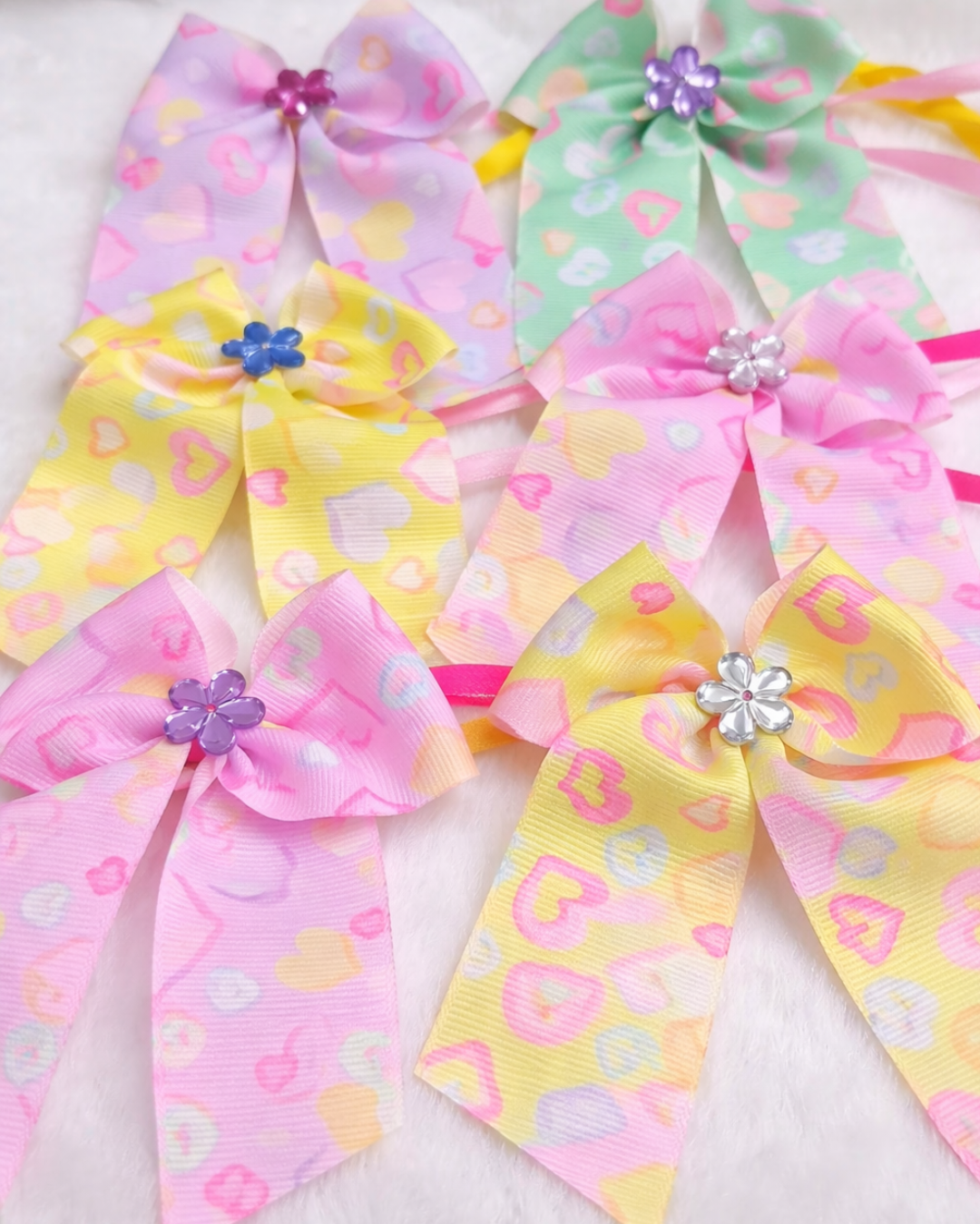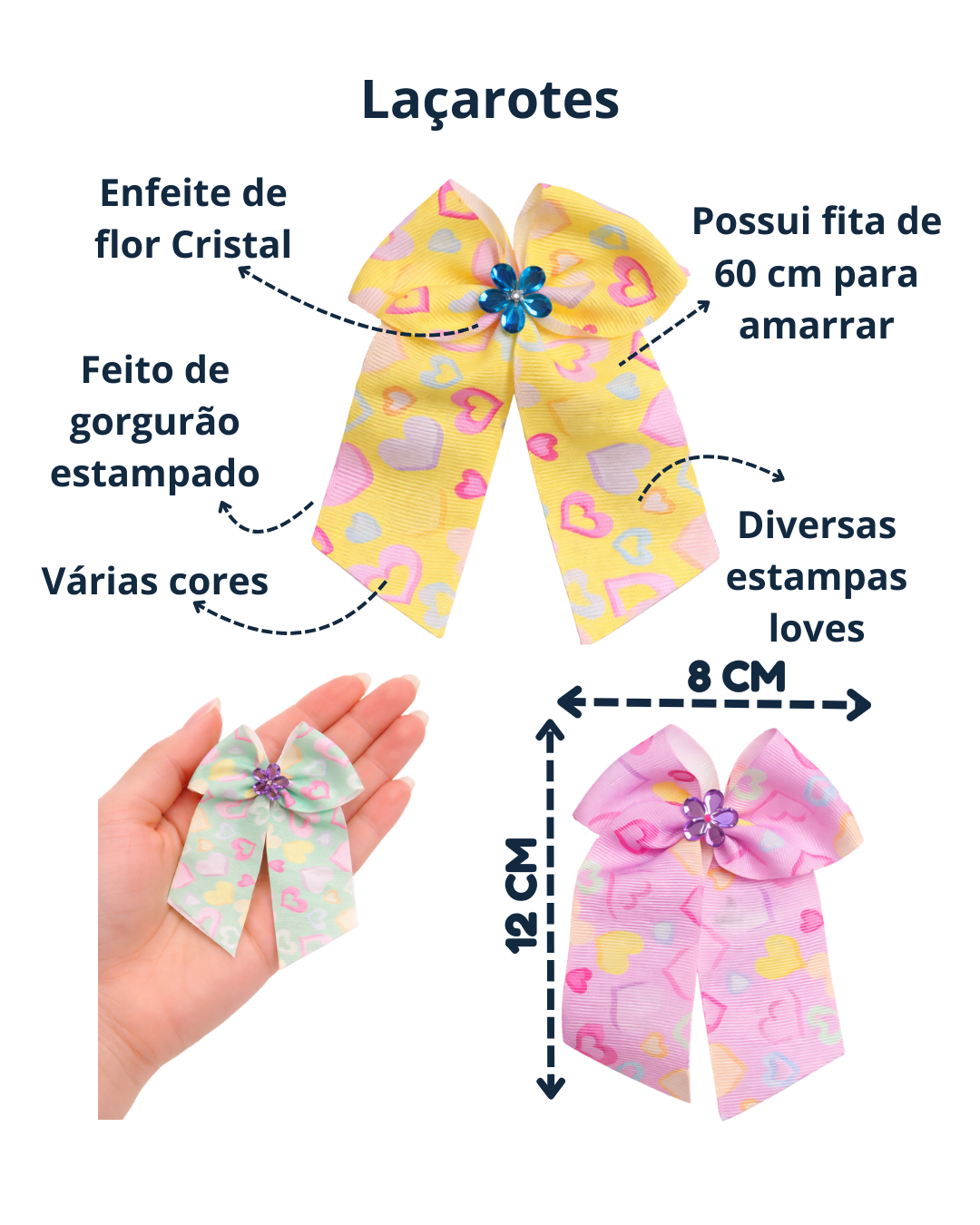 Este laçarote exclusivo JW Laços é produzido em fita de gorgurão estampado com corações (estampa Love) e conta com um lindo enfeite de flor em cristal, trazendo charme e sofisticação.